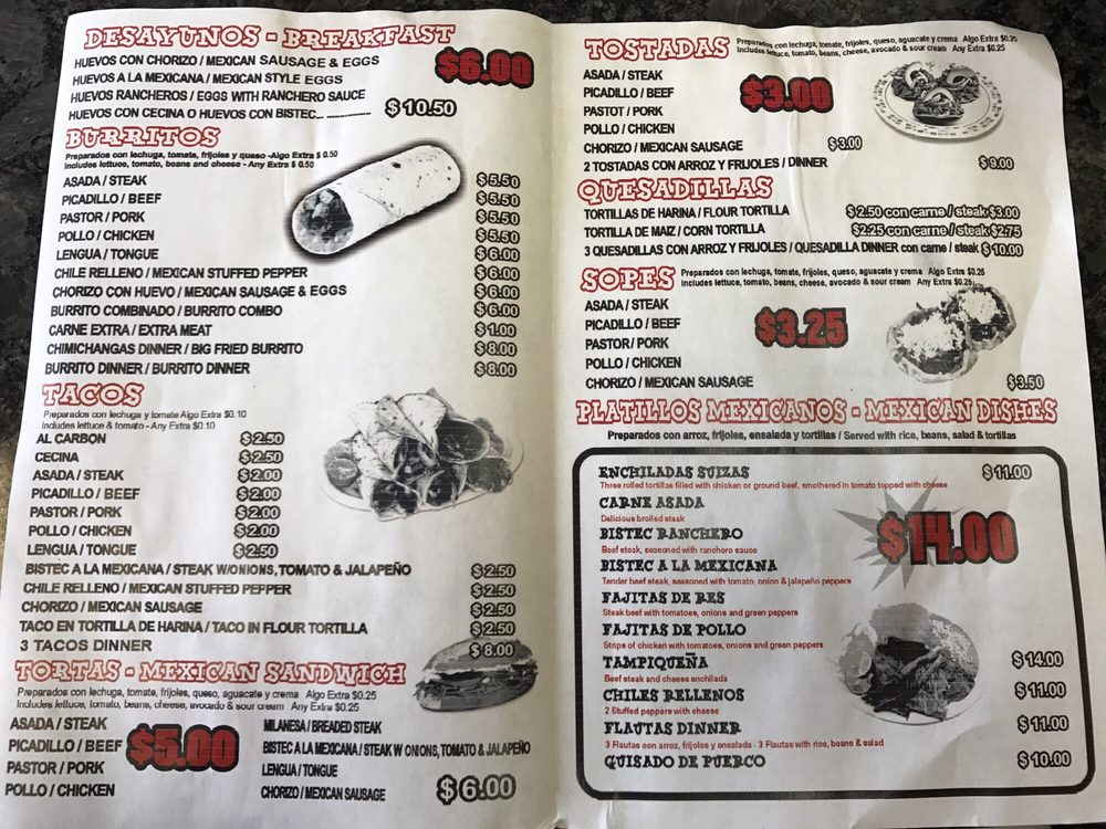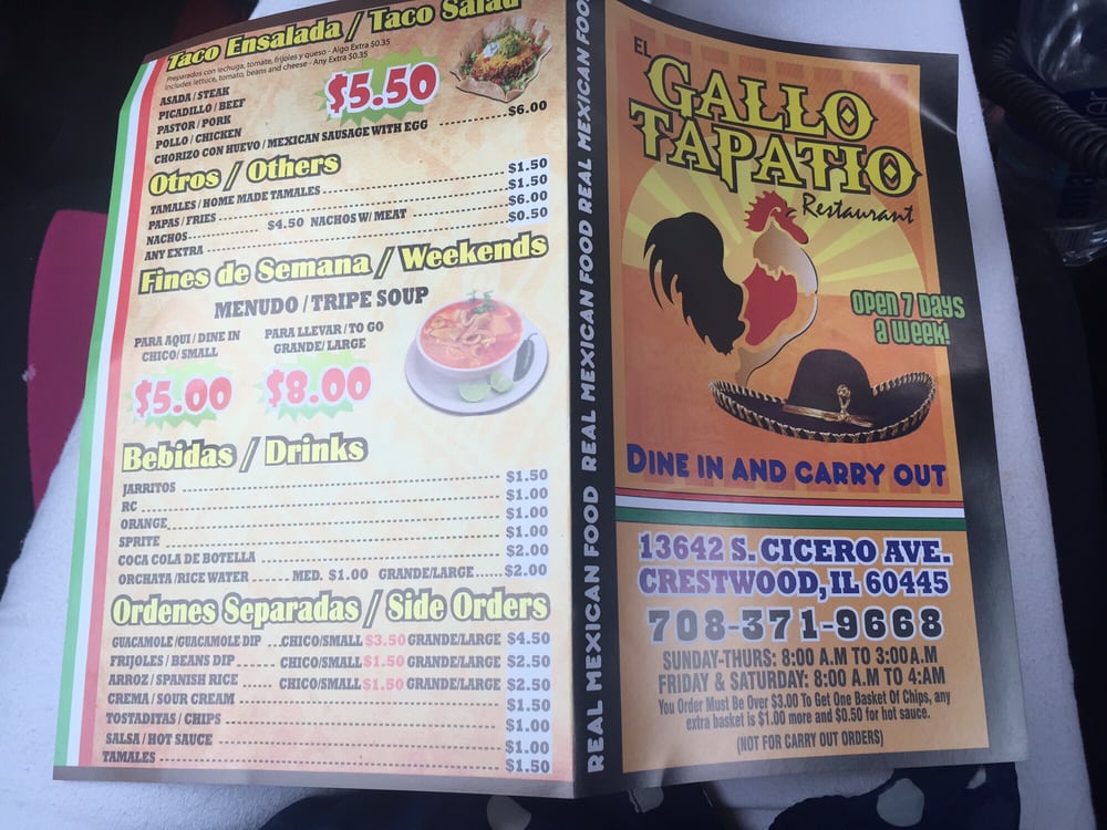 Introducing the menu at El Gallo Tapatio II, a Mexican restaurant located in Crestwood, IL. This divey and casual spot offers a variety of options, from traditional Desayunos like Huevos con Chorizo and Huevos Rancheros to flavorful Burritos such as Pastor and Pollo. Their selection of Tacos, including Al Carbon and Asada, are sure to satisfy your cravings. Customers rave about the generous portions of meat in their dishes, the friendly staff, and the fast service. With affordable prices and delicious flavors, El Gallo Tapatio II has become a favorite spot for locals and visitors alike. Don't miss out on their carne asada taco dinner or the nachos, recommended by loyal customers. This gem of a restaurant is perfect for lunch, dinner, or a late-night bite.